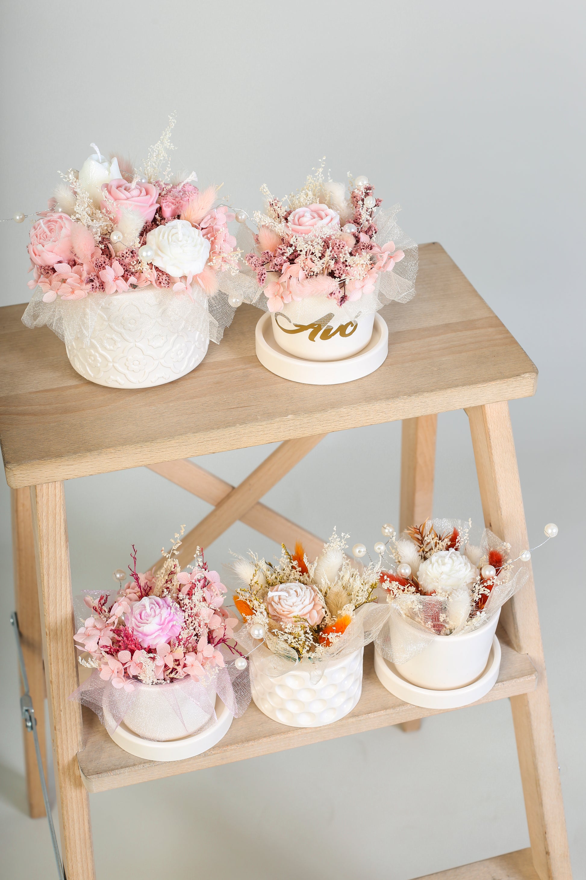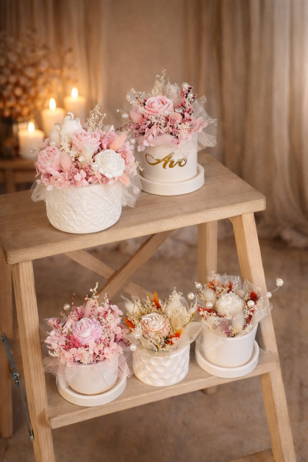 Cada arranjo é feito à mão, combinando flores preservadas, velas de cera de soja e pérolas decorativas, num vaso em tons neutros e elegantes em jesmonite (um material resistente e duradouro).