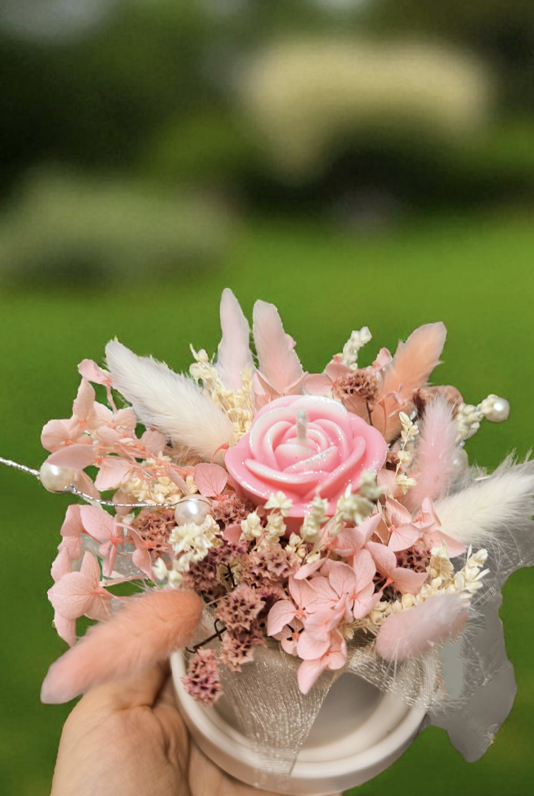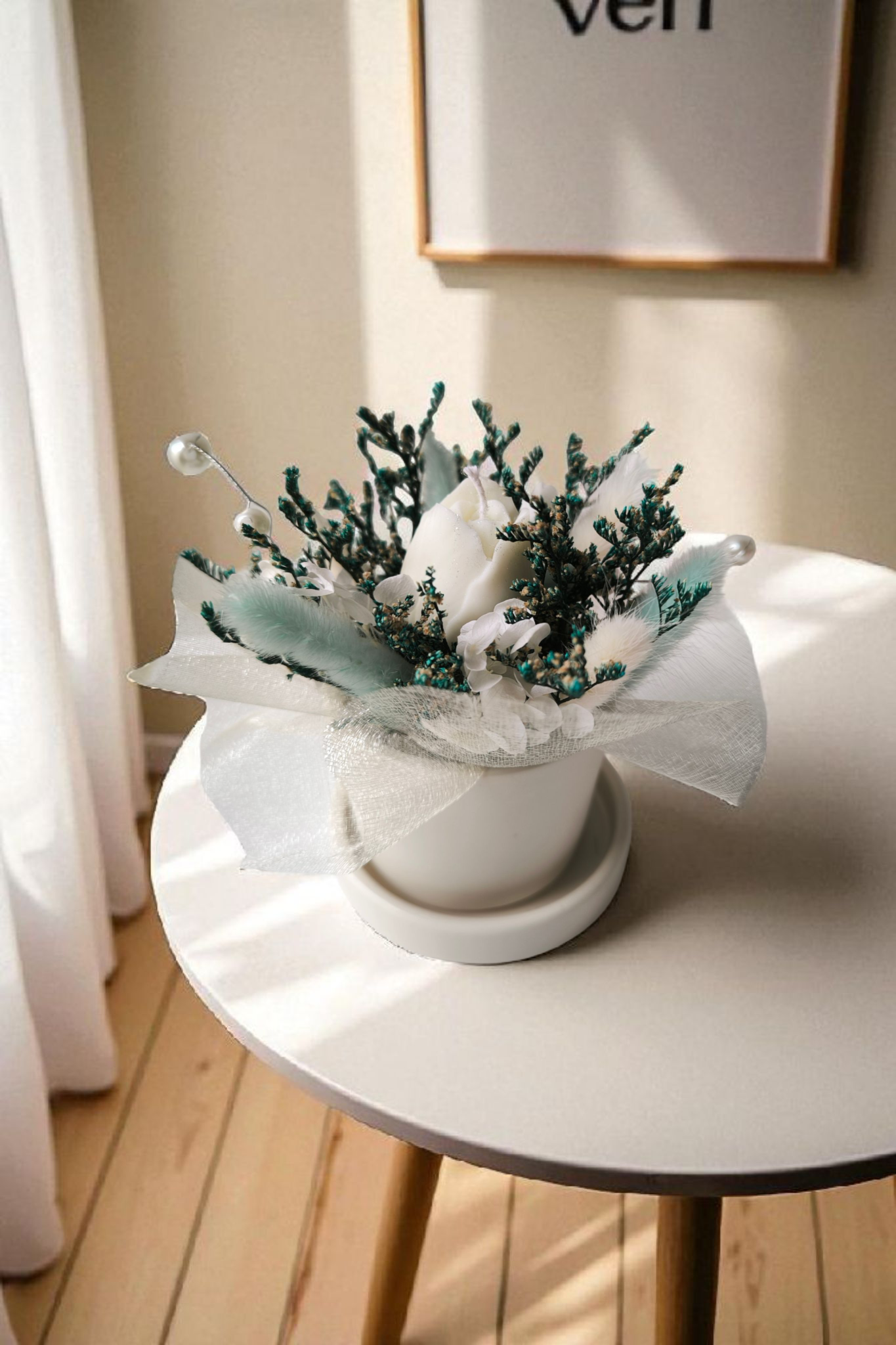 Cada arranjo é feito à mão, combinando flores preservadas, velas de cera de soja e pérolas decorativas, num vaso em tons neutros e elegantes em jesmonite (um material resistente e duradouro).