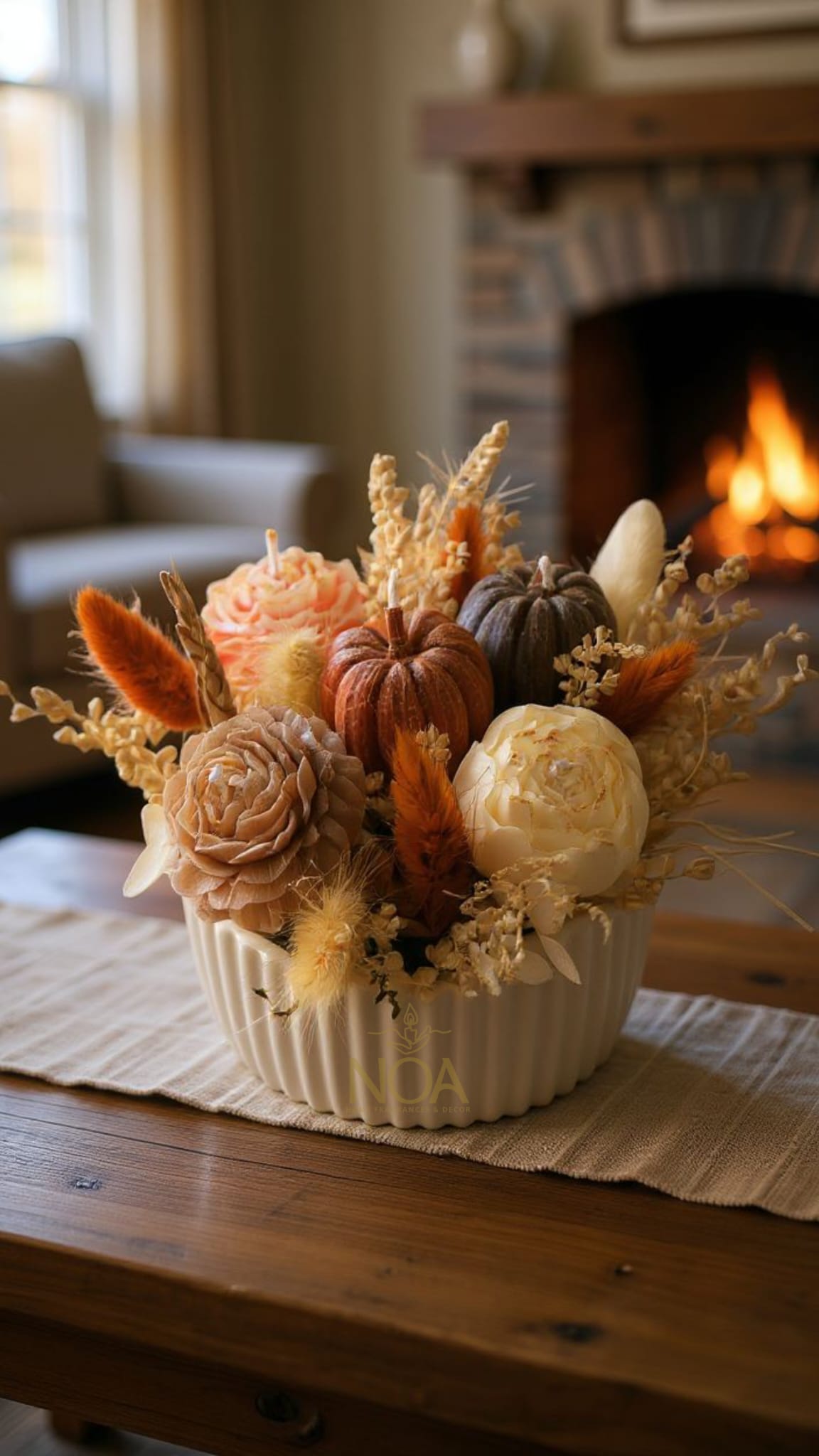 Arranjo Outonal com velas e flores preservadas