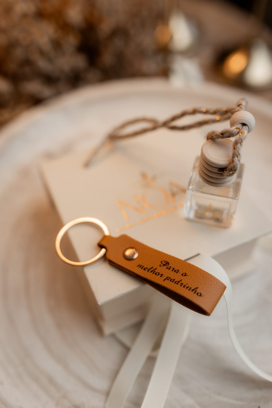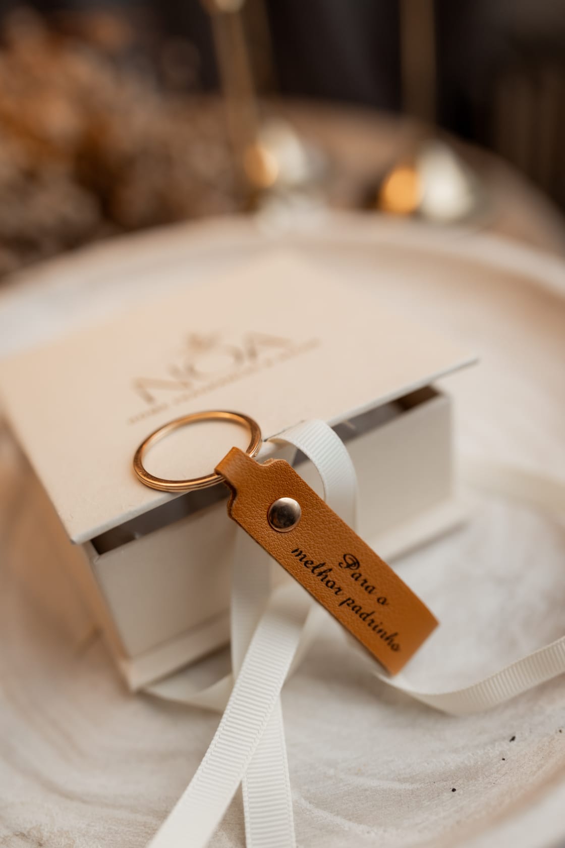 – Porta-chaves em pele sintética com a gravação “Para o melhor padrinho”