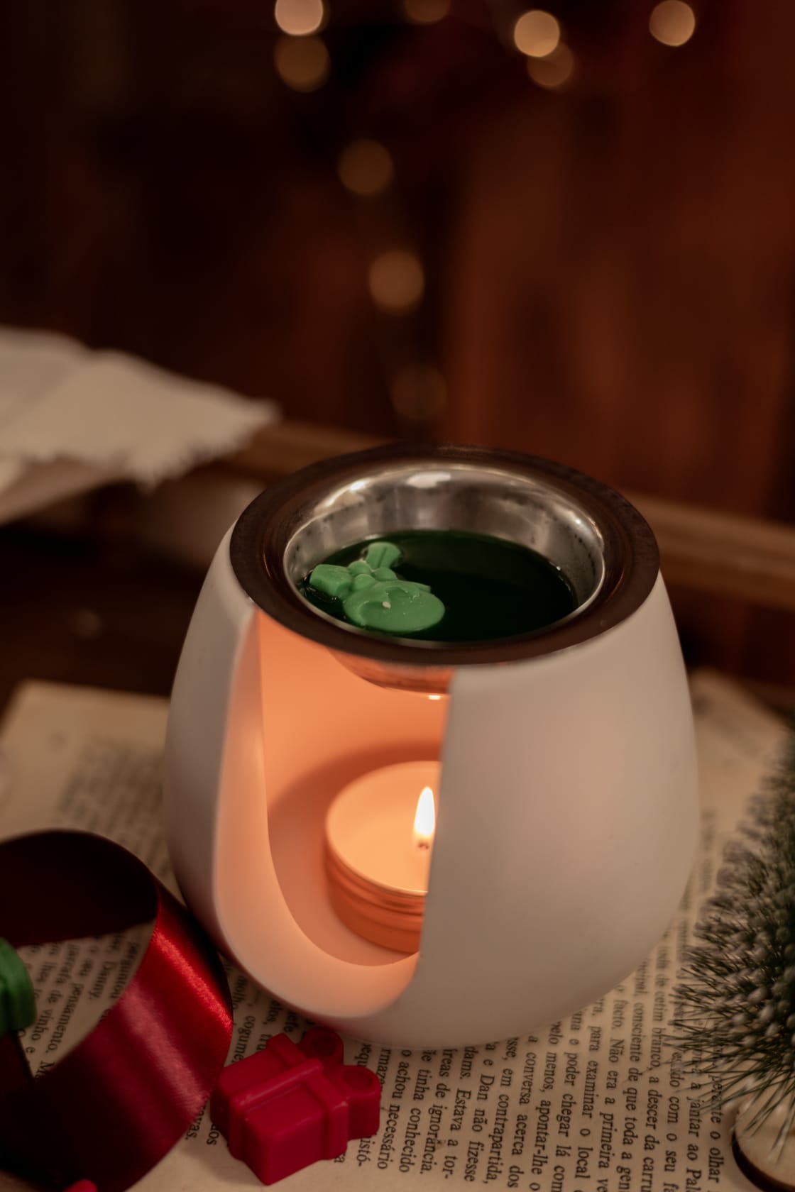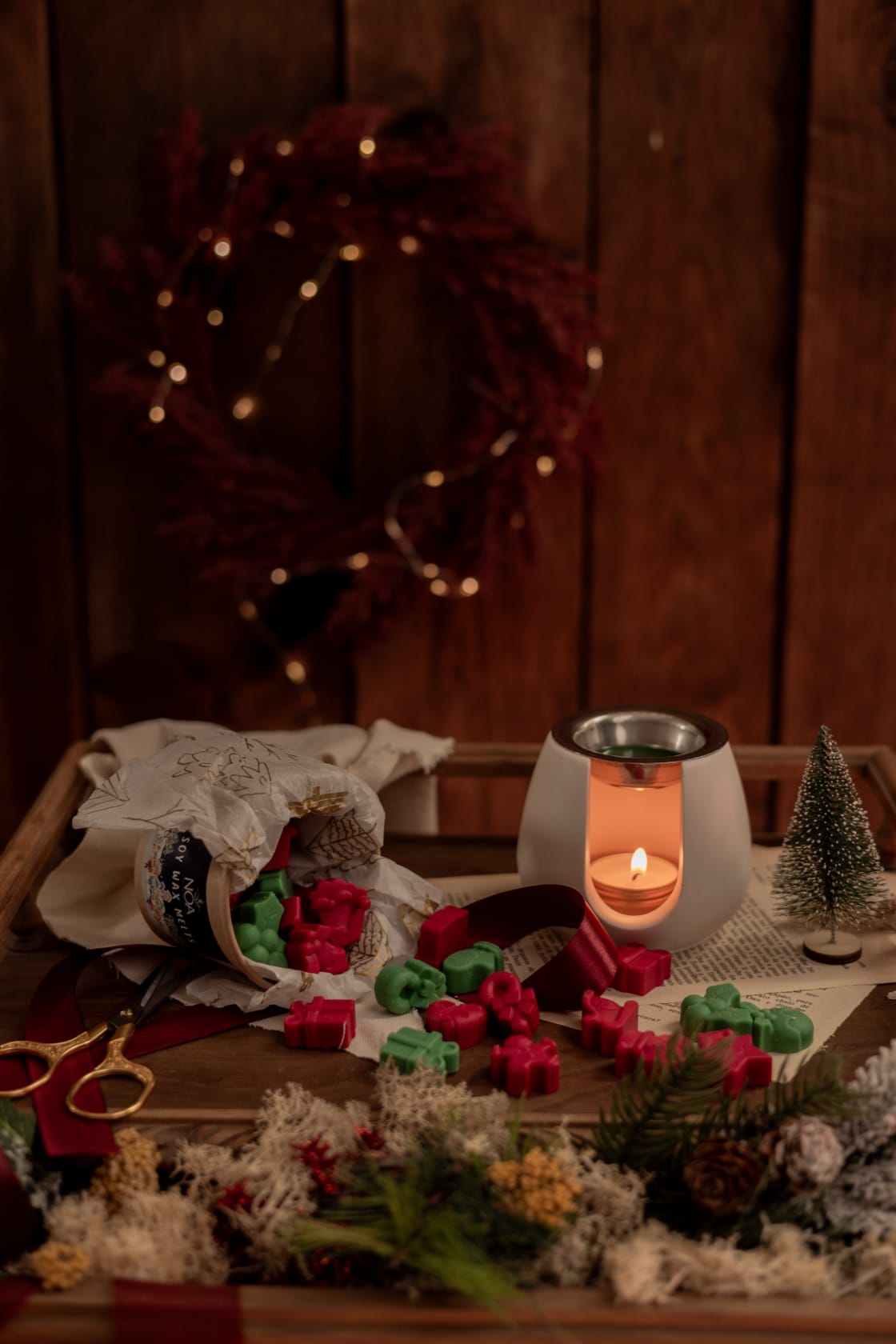 - Queimador em Jesmonite e caixa de 100 g de cera derretida com figuras natalícias em vermelho e verde.