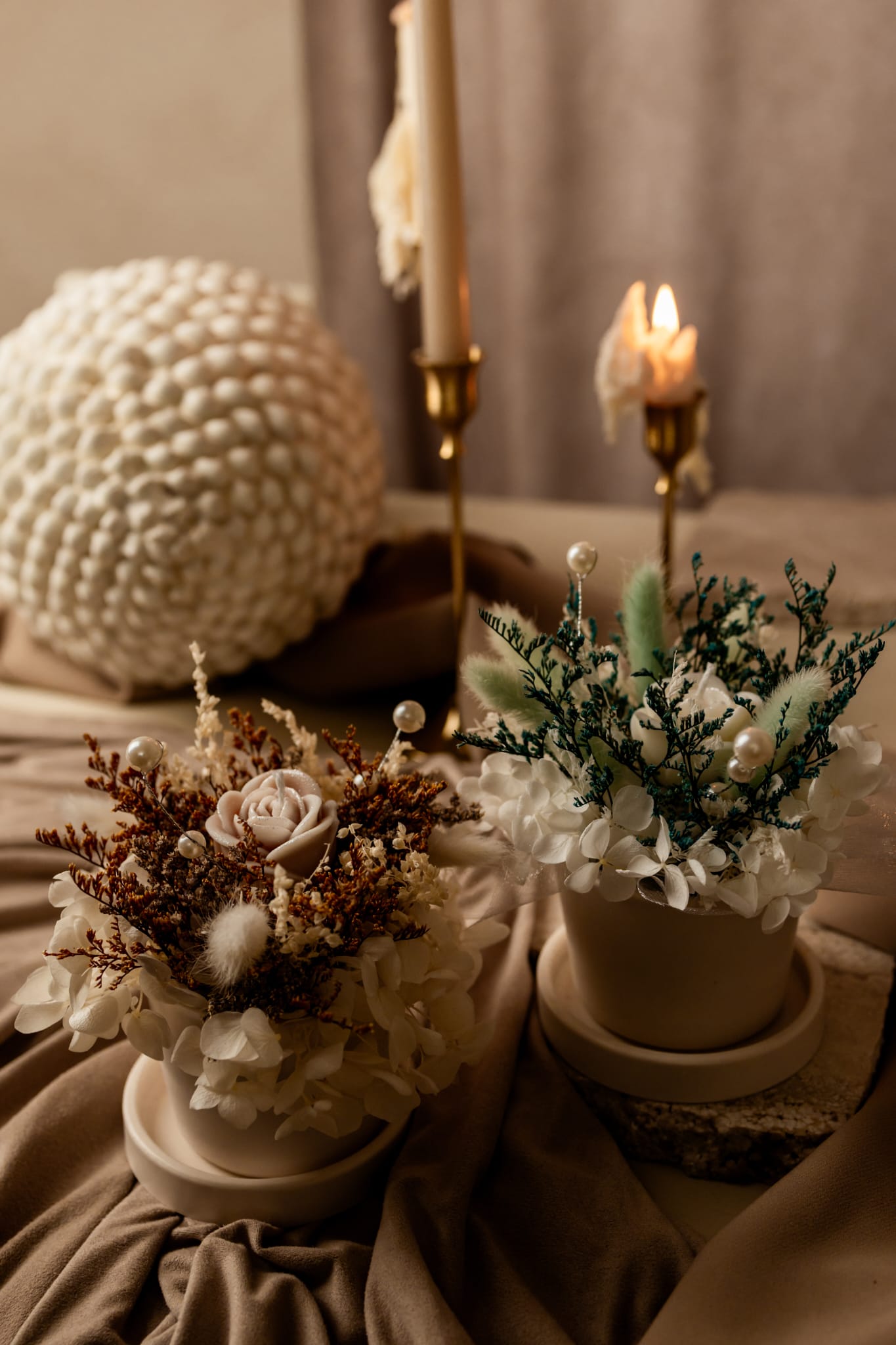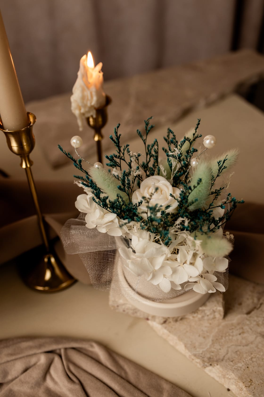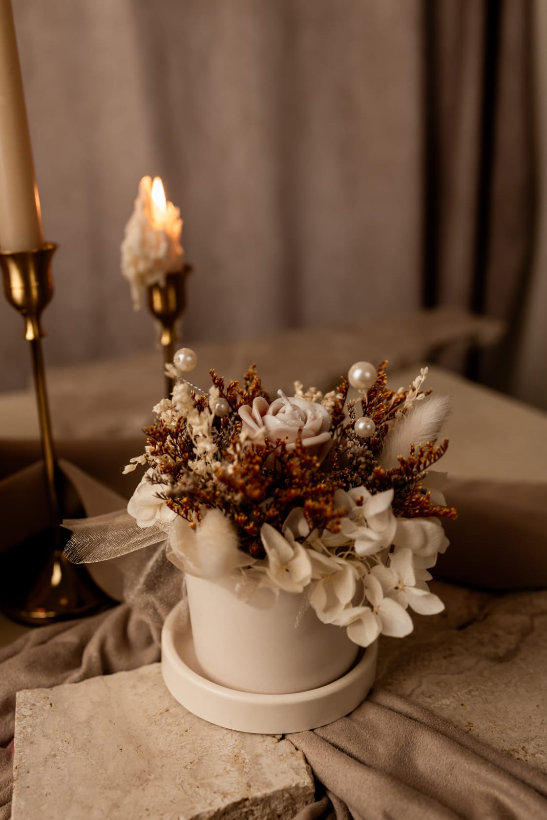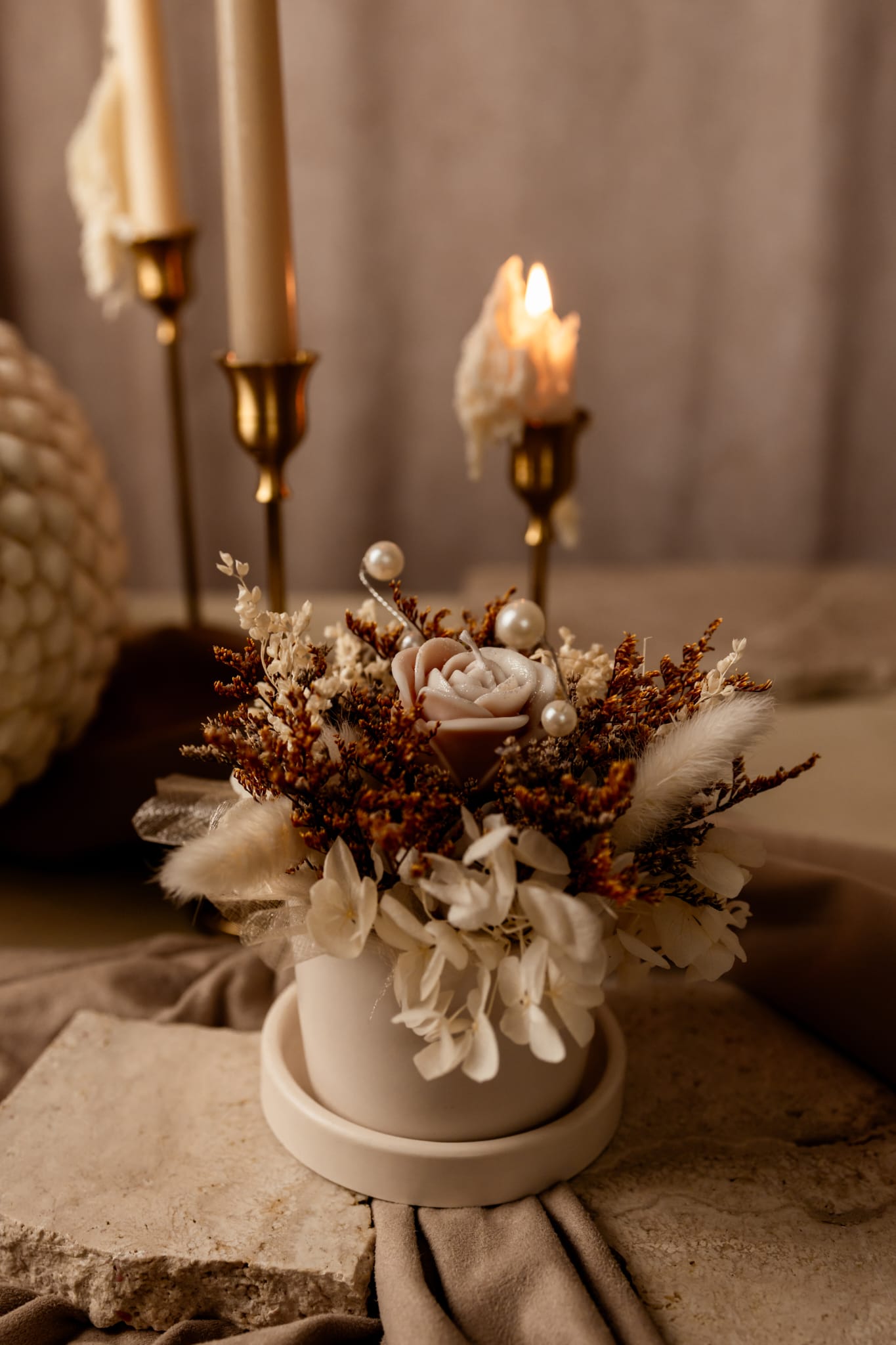 O arranjo de flores preservadas, combinado com a vela em formato de rosa, cria um conjunto delicado e intemporal — perfeito para oferecer ou para dar um toque especial à tua casa.