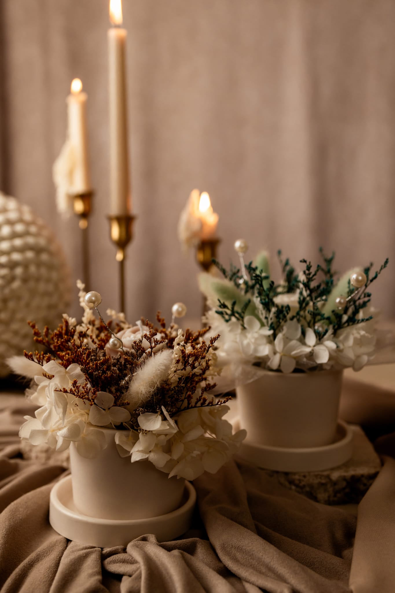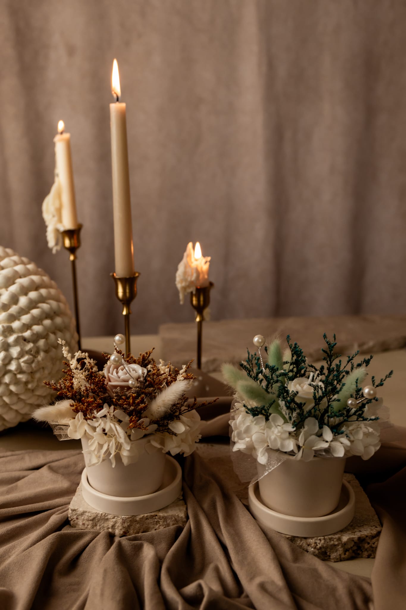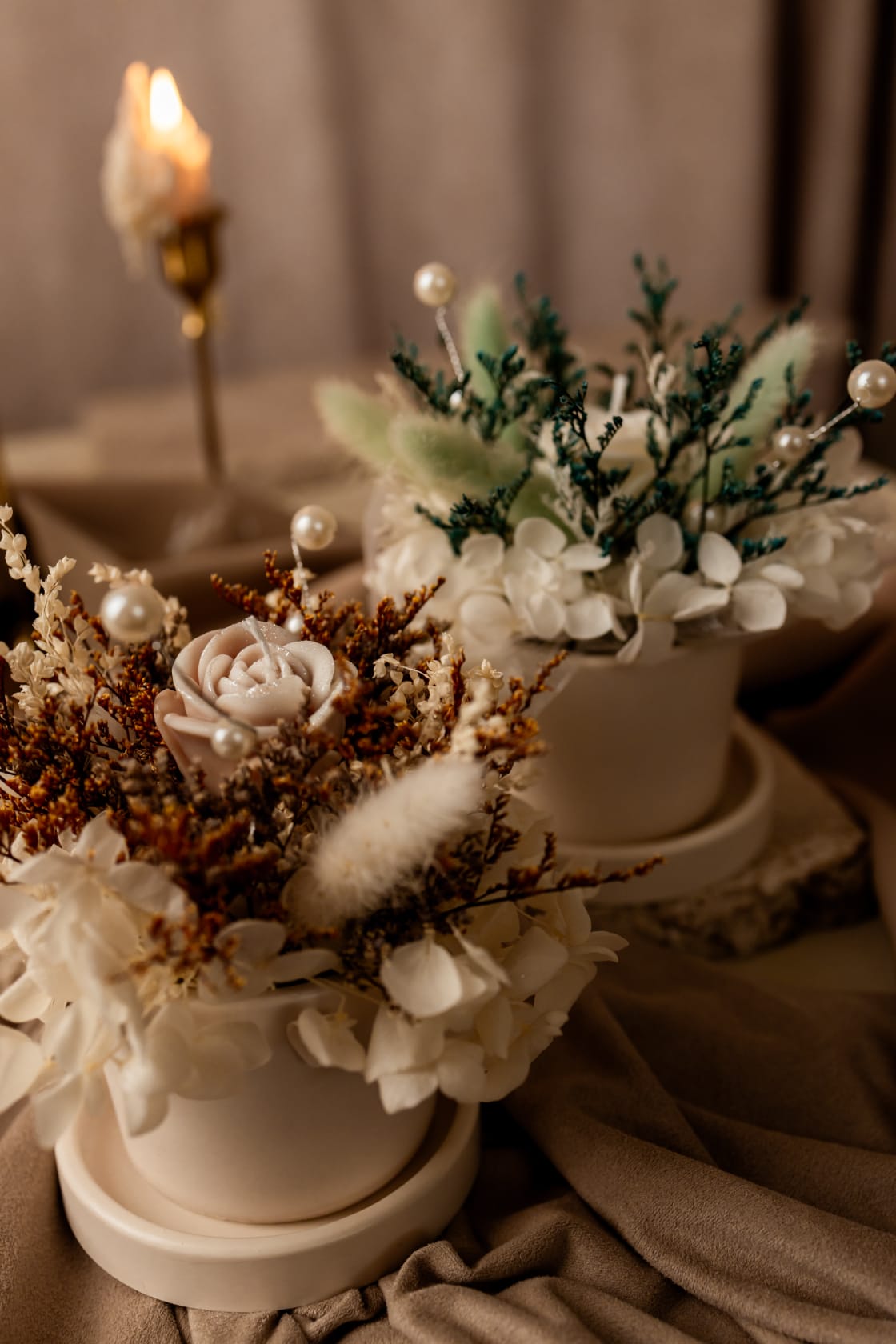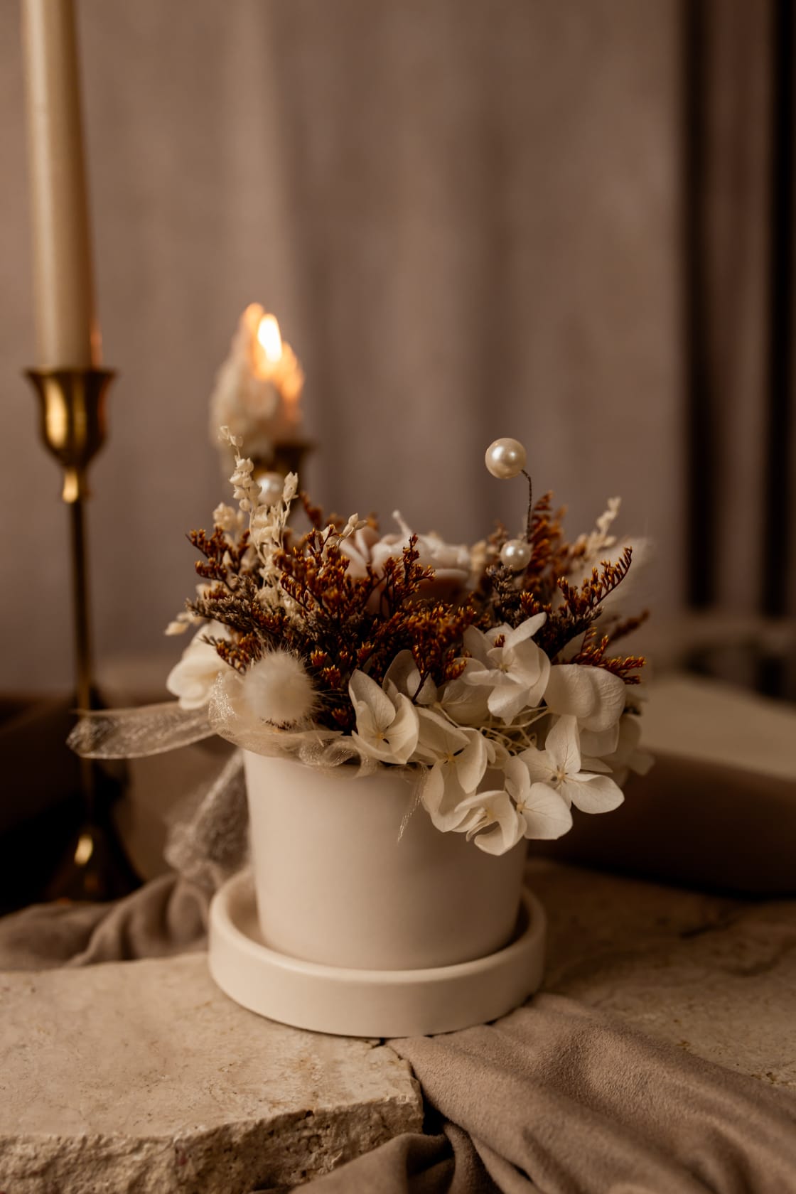 O arranjo de flores preservadas, combinado com a vela em formato de rosa, cria um conjunto delicado e intemporal — perfeito para oferecer ou para dar um toque especial à tua casa.