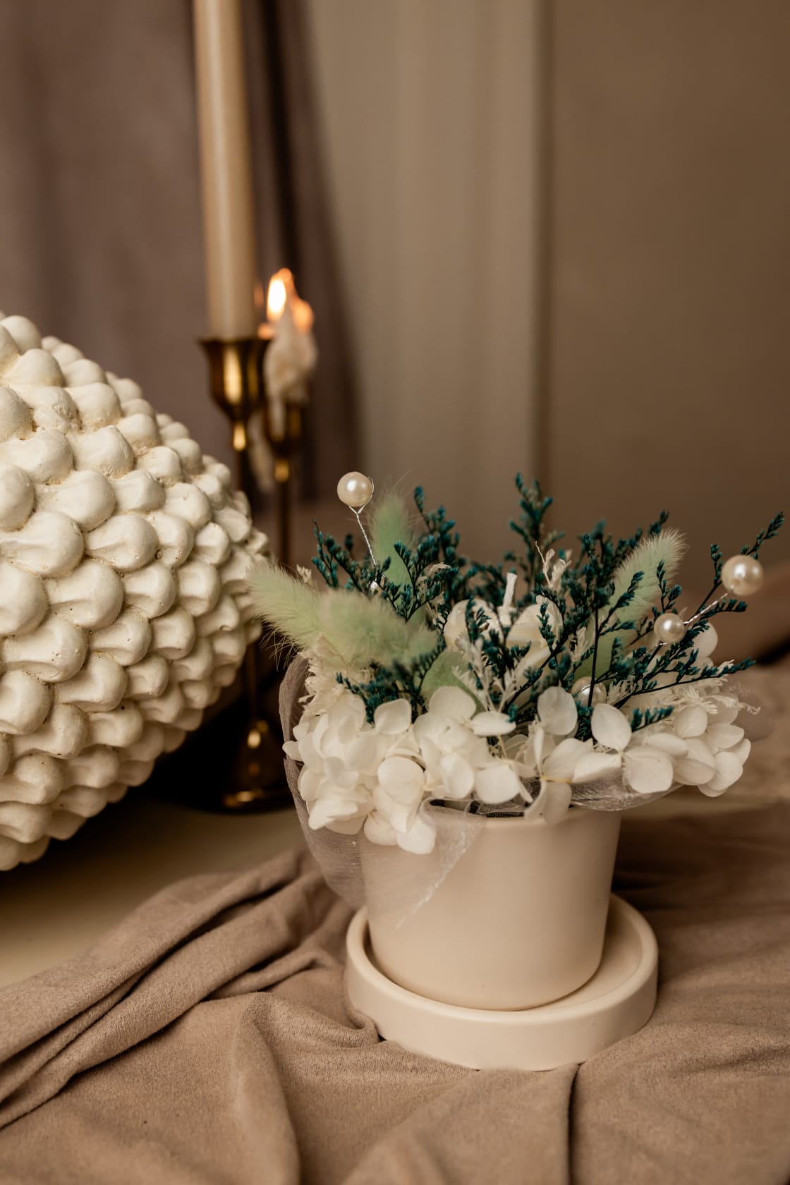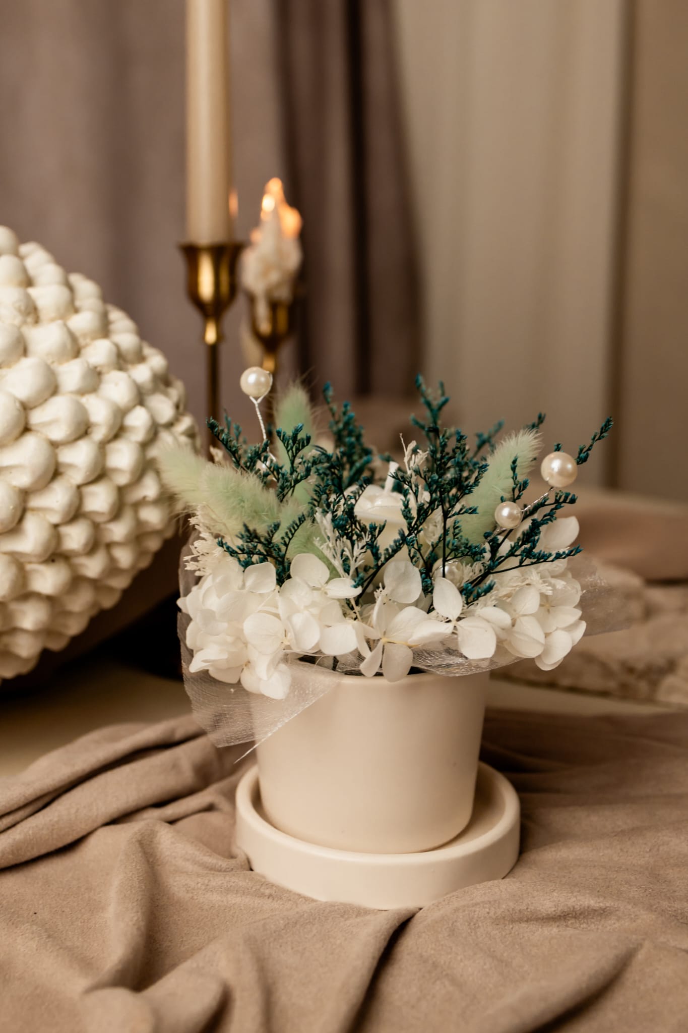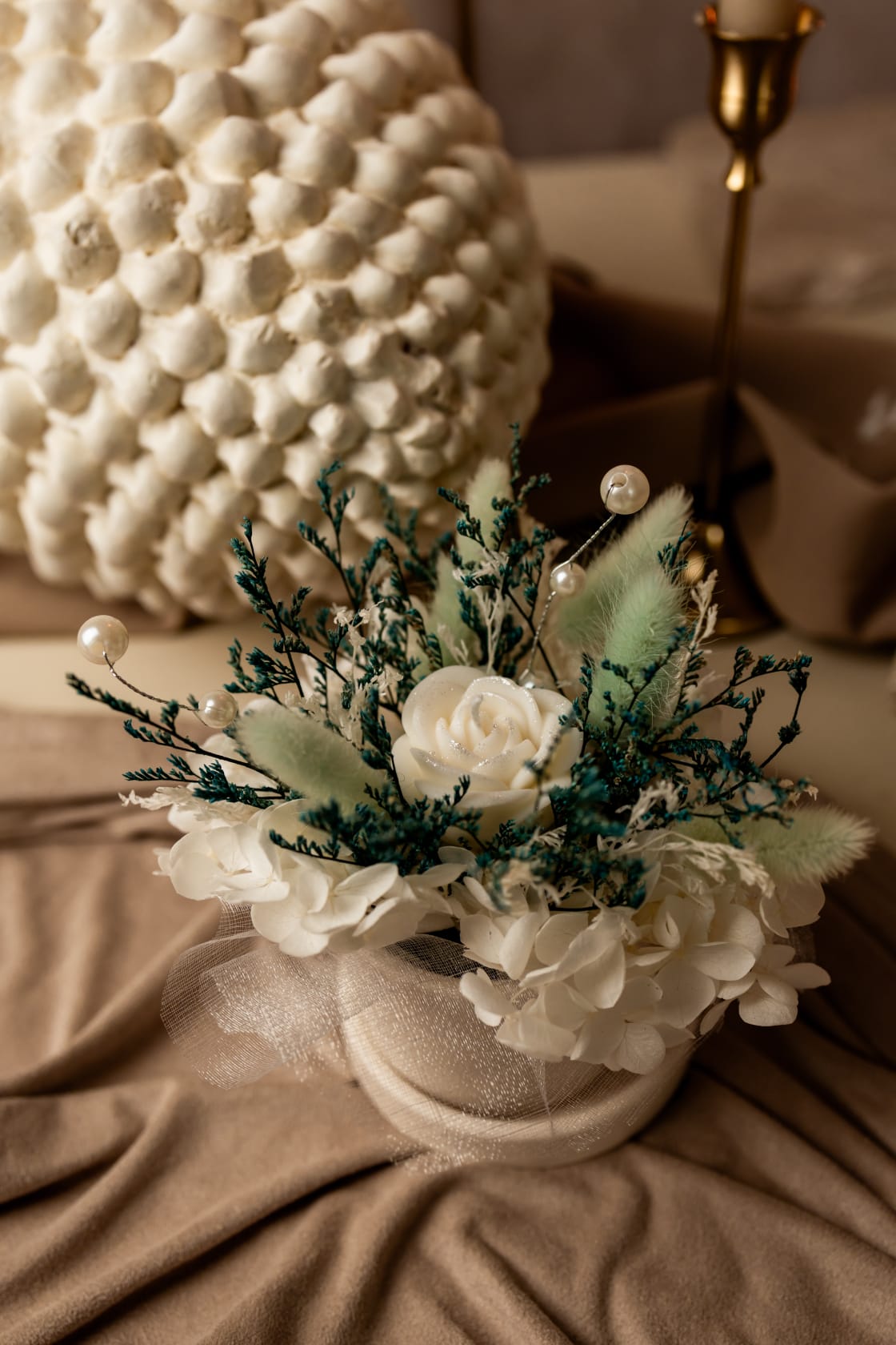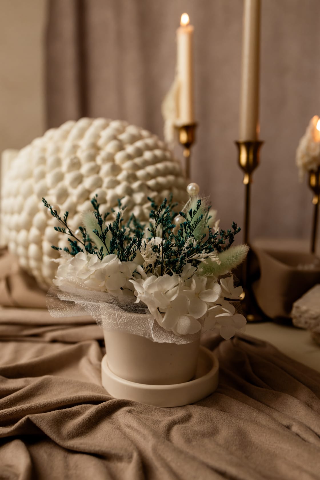O arranjo de flores preservadas, combinado com a vela em formato de rosa, cria um conjunto delicado e intemporal — perfeito para oferecer ou para dar um toque especial à tua casa.
