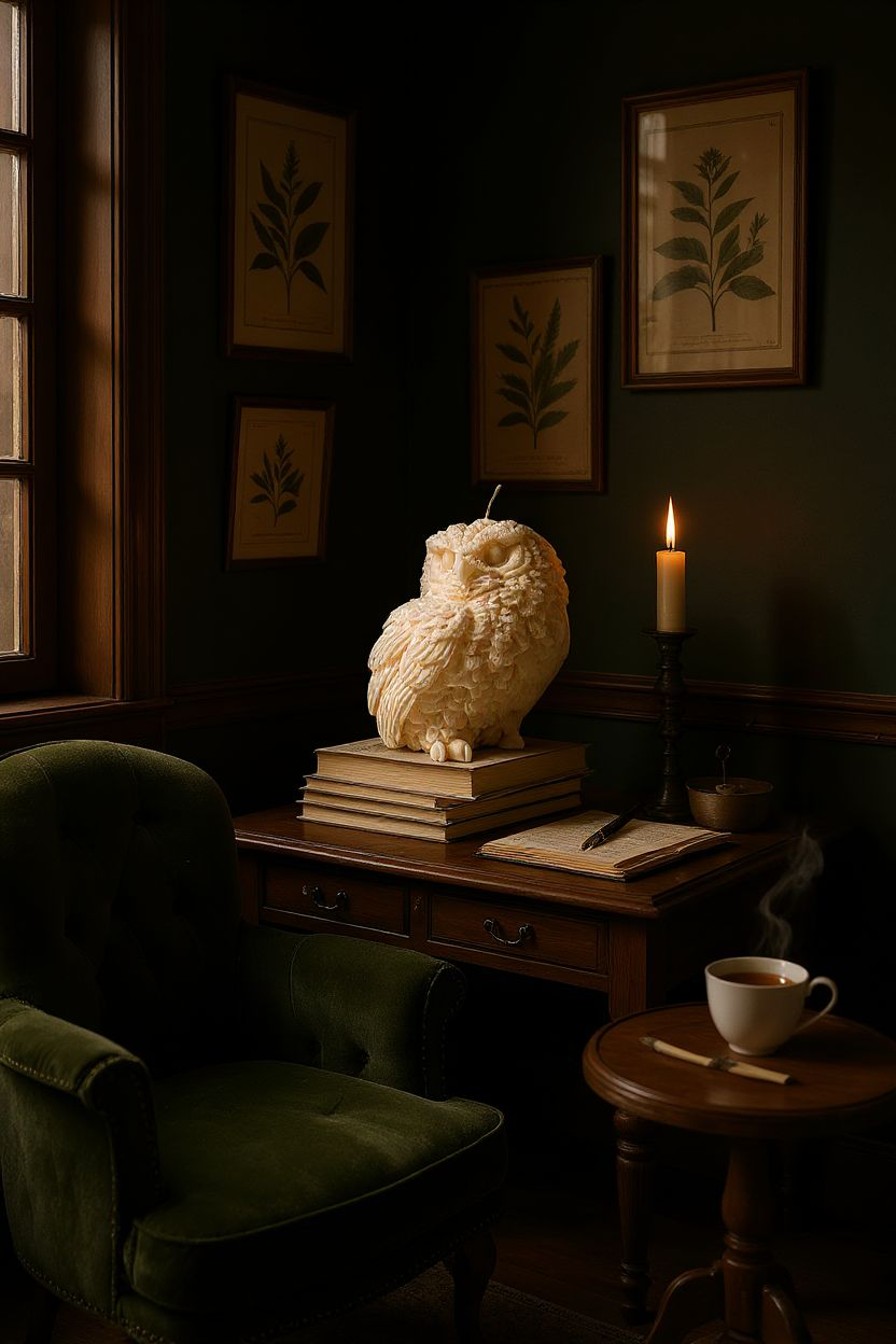 A vela coruja, feita em cera de soja de alta qualidade e pavio de algodão, combina detalhe e aconchego numa só peça.